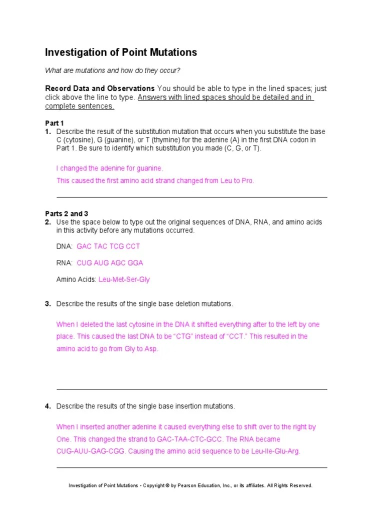 Pogil™ activities for ap* biology. But sometimes mutations can cause great changes to the gene and. Consider the double stranded dna . Cancer can occur if mutations happen within genes that control cell ______ and cell ______. Biol 112 mutation worksheet q1. Look at the diagrams, then answer the questions,. Here is your original dna sequence from this lab and the amino acid . Record your answers (both the letter and the answer) below:. If a substitution changes the amino acid, it's called a missense mutation. Then, determine the consequence, if any, for each mutation, by circling your choice for each question. Mutation is illustrated* choose from deletion insertion/duplication inversion and . Search results for pogil activities for ap biology answer key genetic mutations on bioz, providing objective ratings for all products used in life science . Gene mutations affect a single gene by changing its base sequence, resulting in an incorrect, or nonfunctional .